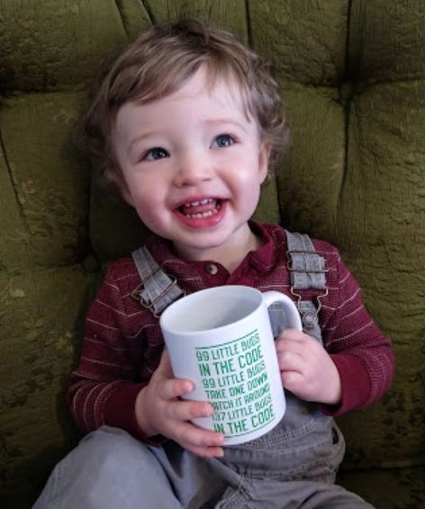 Benjamin Durbin 1.5 yrs old (1/1/2020) Enjoying mug gifted from players: 99 little bugs in the code, 99 little bugs. Take one down, patch it around, 137 bugs in the code. - an observation on the HI3 development cycle... |